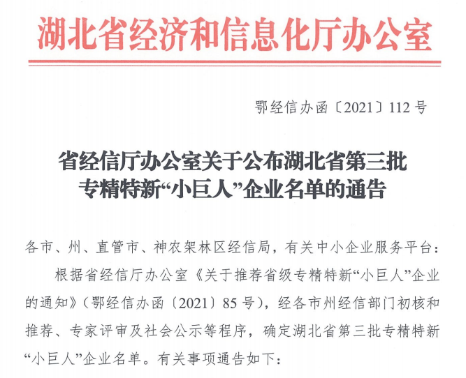 12月24日,湖北省经济和信息化厅发布通告,经企业自主申报、各市州经信部门初核和推荐、专家评审及社会公示等程序,三川德青机械公司成功入选湖北省第三批专精特新“小巨人”企业名单。这是公司继2021年荣获湖北省支柱产业细分领域隐形冠军“科技小巨人”称号以来,获得的又一项重要荣誉。