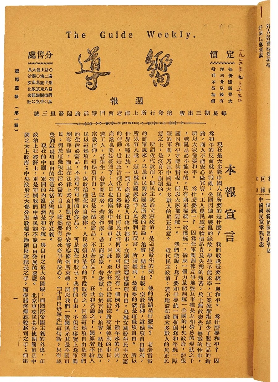 1922年9月13日,中国共产党机关刊物《向导》周报在上海创刊。图为该刊创刊号。